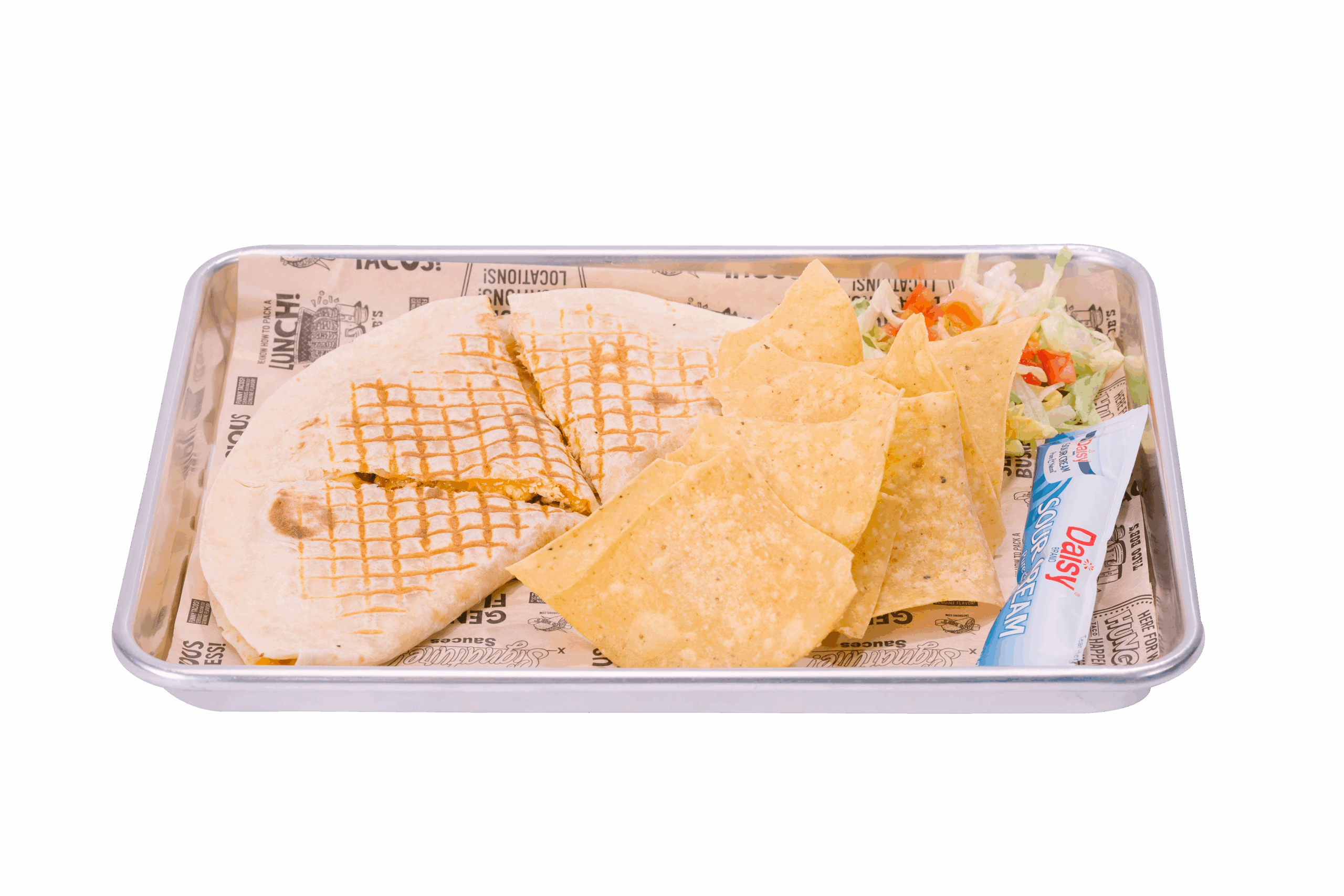 Your choice of Chicken, Beef, Bean, Rice, or only Cheese. Topped with Shredded Cheese and grilled on a 10″ Flour Tortilla. Served with Tortilla Chips, Lettuce, Tomato and Sour Cream.