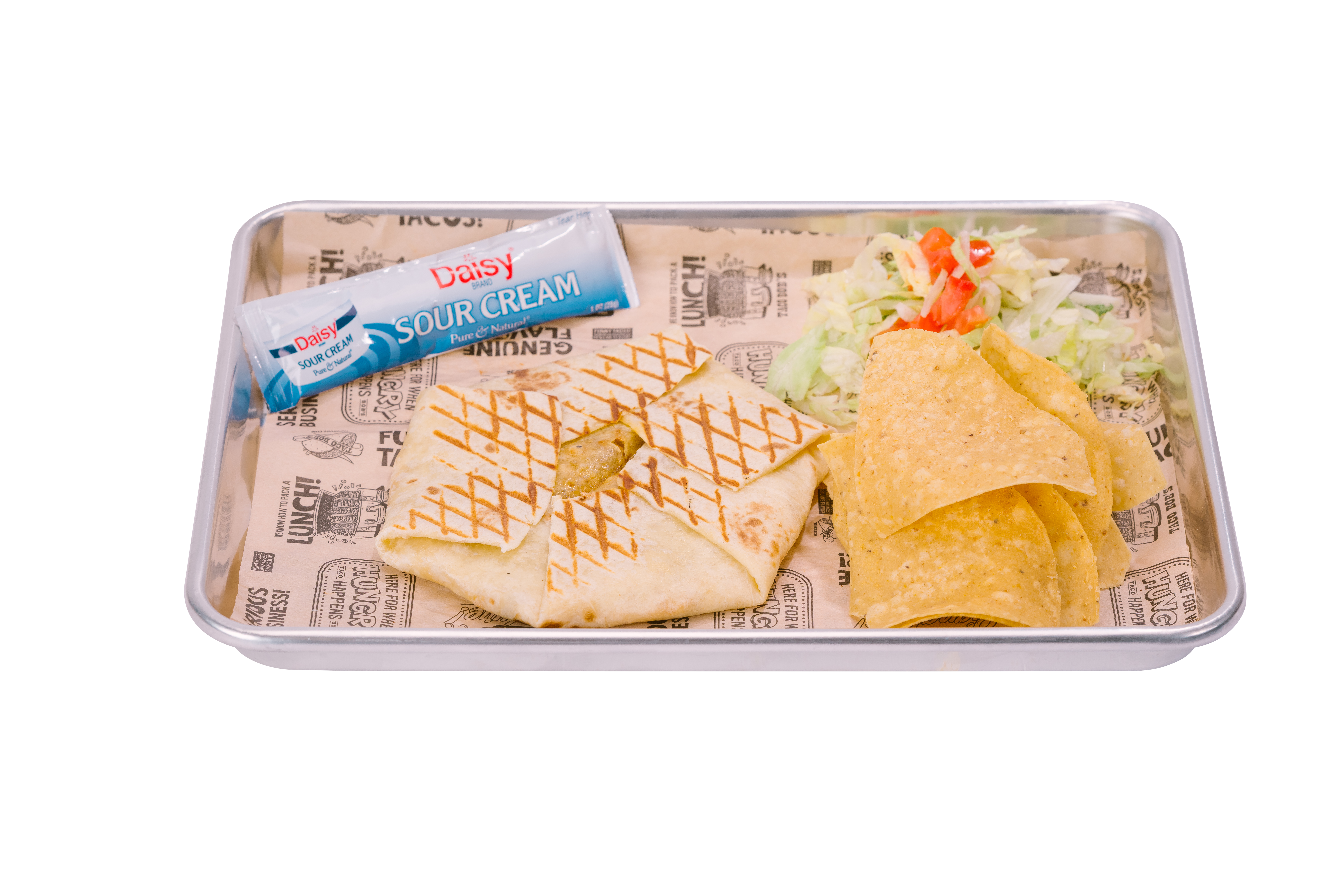 Tostada with meat on a 10″ Flour Tortilla with Nacho Cheese, grilled to perfection. Includes a side of Lettuce, Tomato, Sour Cream and Tortilla Chips.