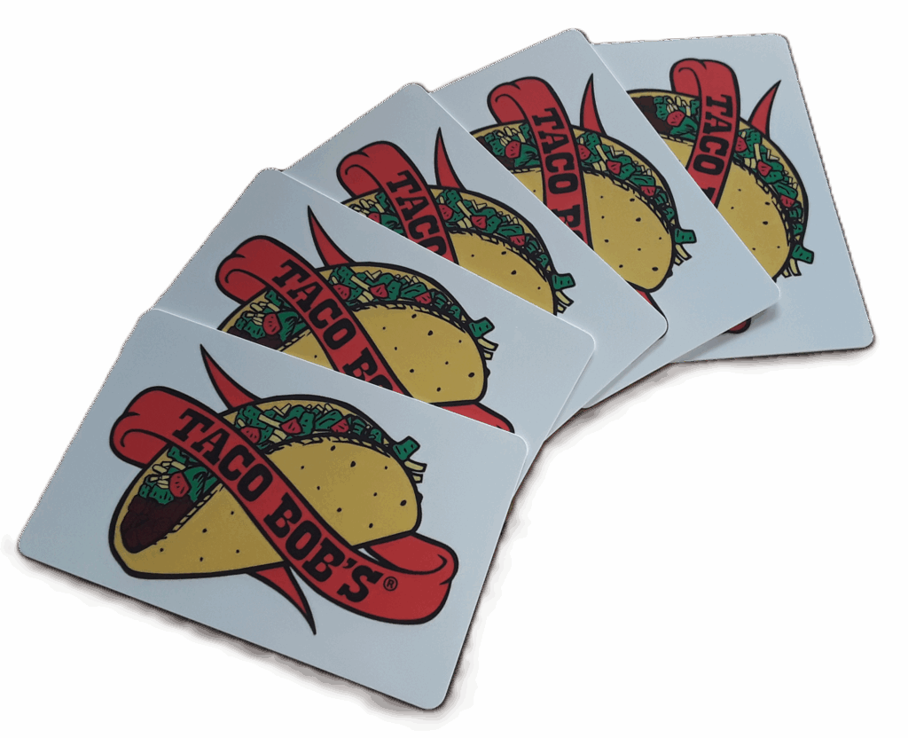 MErch. Taco BOb'S E-Gift Card Treat your family and friends to a Taco Bob’s E-Gift Card, perfect for any occasion! No plastic, no paper needed. Just simply sent to your loved one’s smartphone and redeemed during their transaction. ChOoSe YOur amOunt Buy Now Taco Bob Santa Ornament $4 +taxIn-Store Only Taco BobKeychain $4 +taxIn-Store Only Taco Bob LogoKeychain $4 +taxIn-Store Only